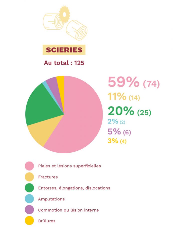 Différentes parties du corps sont touchées par des blessures, mais surtout les bras, mains et doigts sont les plus souvent touchés :